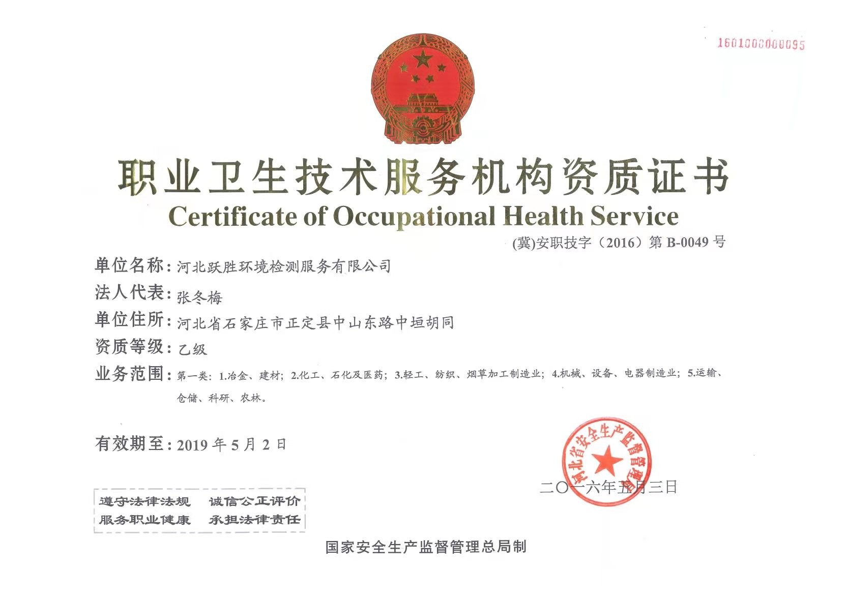 证书编号:(冀)安职技字(2016)第B-0049号